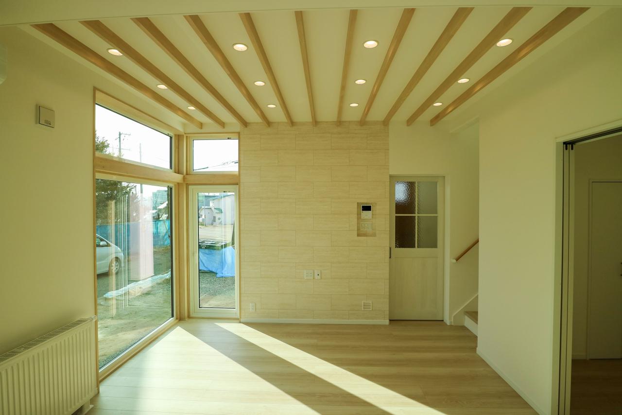リビングはシンプルすぎないように木ルーバーでおしゃれ感up